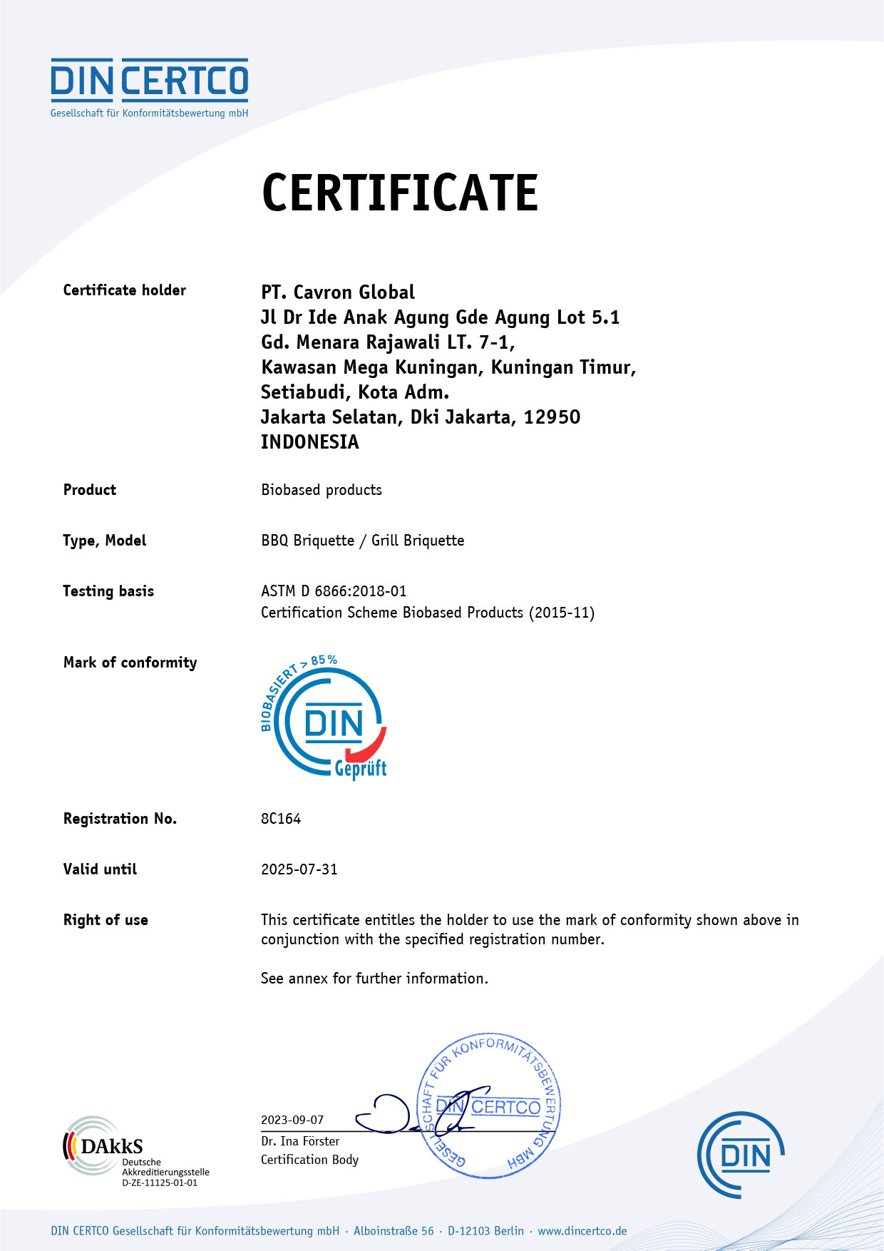 Type of Certificate DIN GEPRUFT BIOBASED