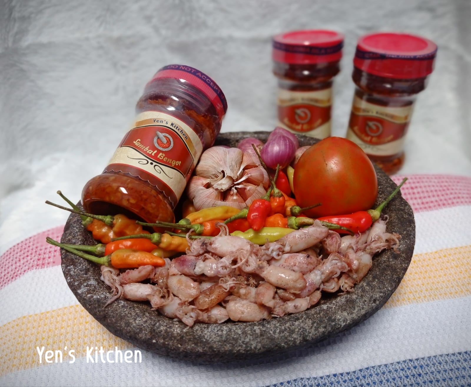This sambal is made with local ingredients including: chili, shallots, garlic, salt, sugar, oil,