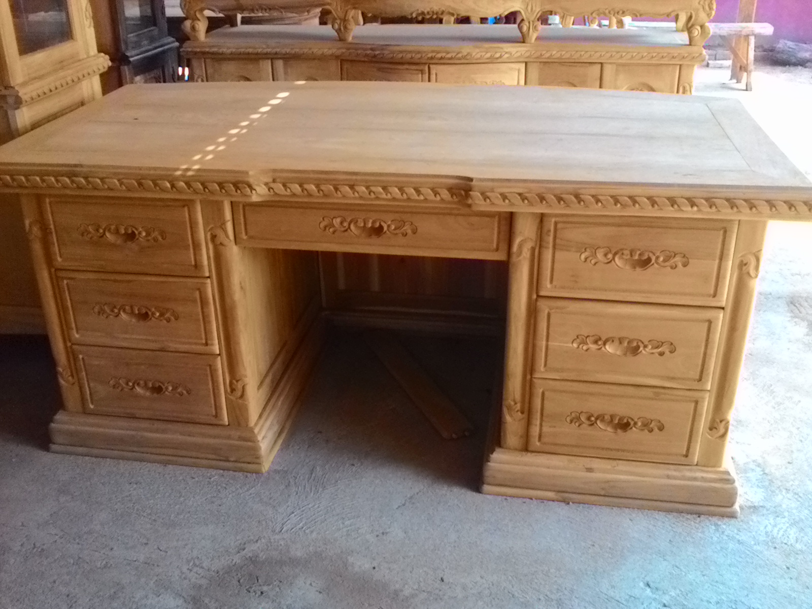 Working teak table with carving ,also completly with glass 8 mm finishing melamine or PU size 150 cm x 60 cm x 70 cm