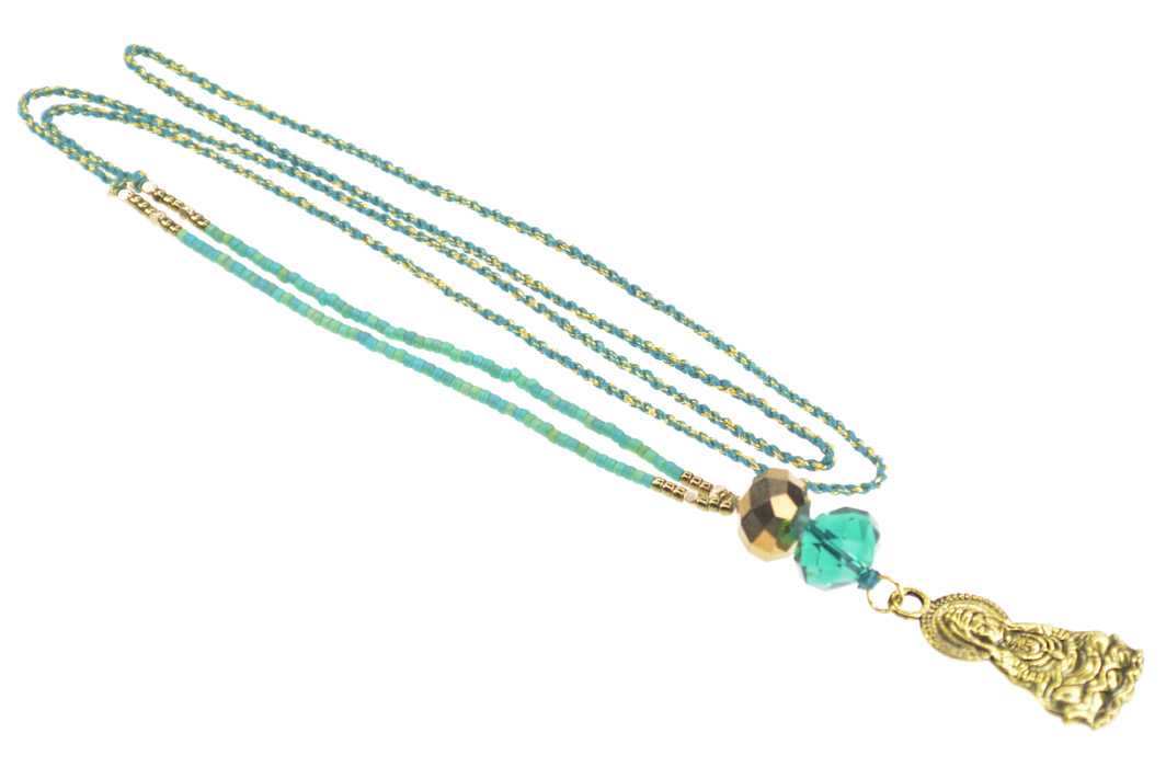 Necklace with Japanese Glass Seedbeads, Crystals and Gold Color Kwan Im Charm on Hand Twisted Mix Colors Cotton String and Metallic Yarn