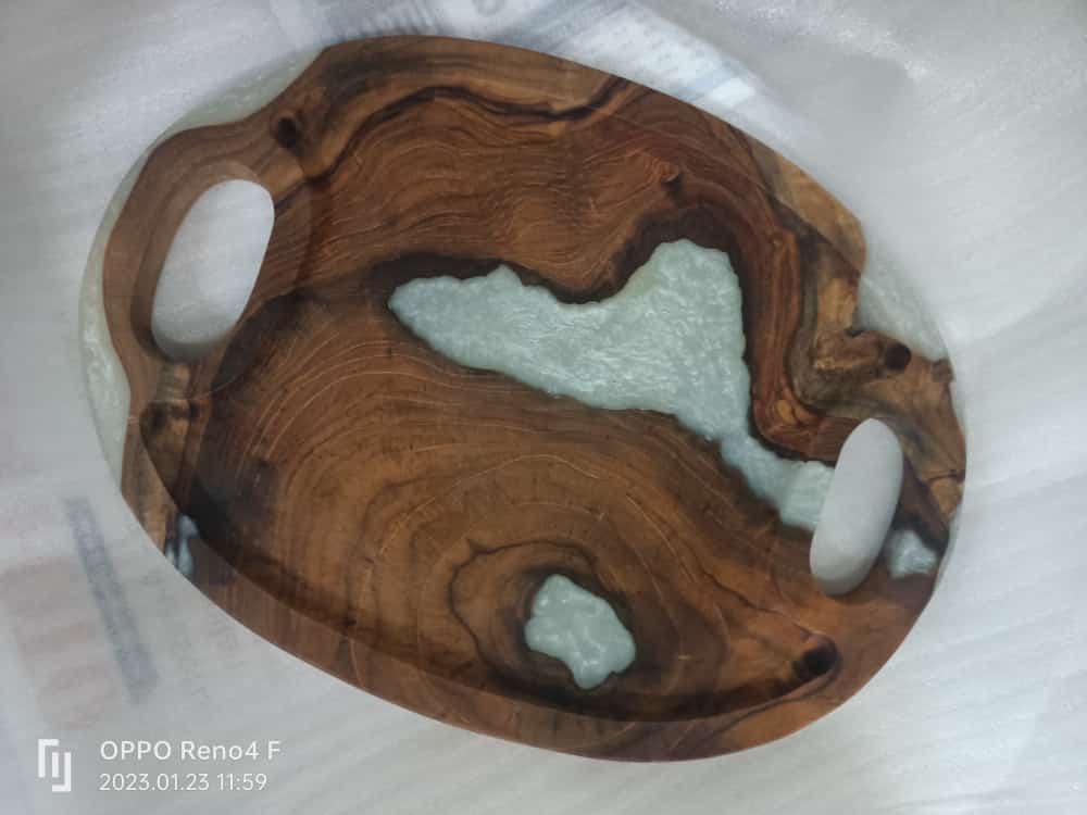 The tray is made of the wood combined with the resin with various color and style