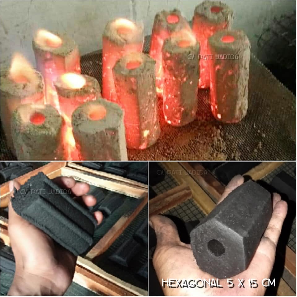 Hexagonal size : 5x15 cm • 100% coconut shell charcoal • The ash content < 3% • Not smelly & easy broken. • Calory 7000 Est Price : 1302 USD FOB Semarang