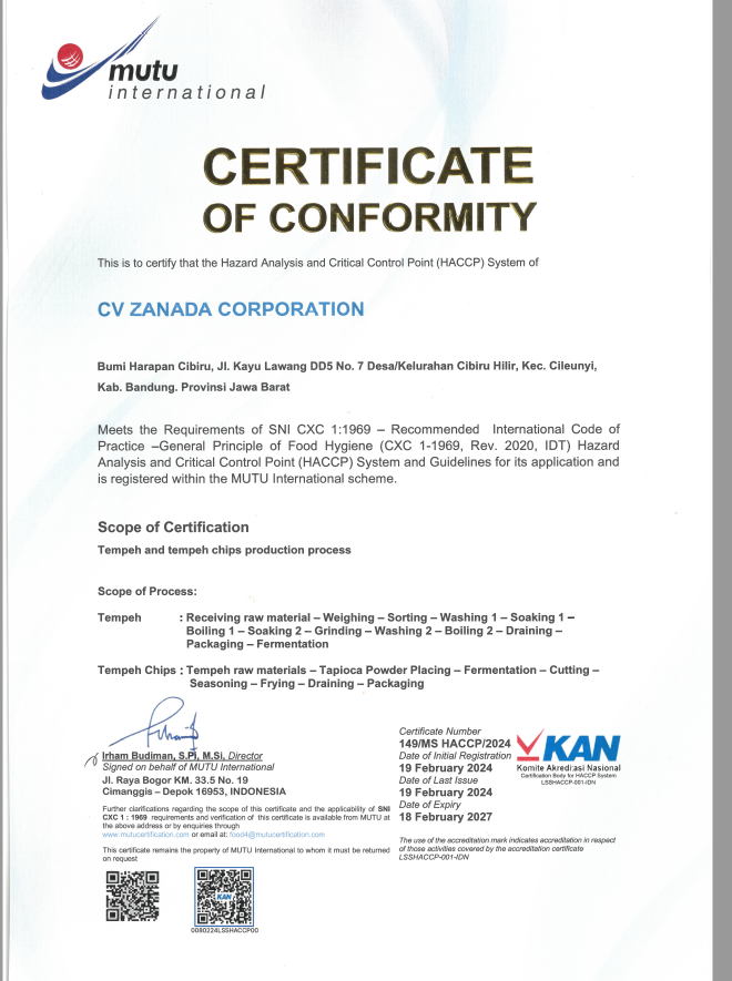 Zanada Corporation is a business which is engaged in processing soybean raw materials into tempe and its derivative products such as tempe chips, tempe nuggets, tempe steak and others. Its business activities provide direct services to consumers, restaurants, organic communities, vegetarian communities and supermarkets.