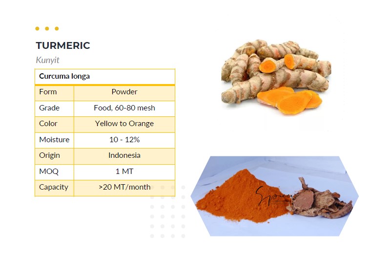 Curcuma longa Form : Powder Grade : Food, 60-80 mesh Color : Yellow to Orange Moisture :10 - 12% Origin : Indonesia Capacity : >20 MT/month