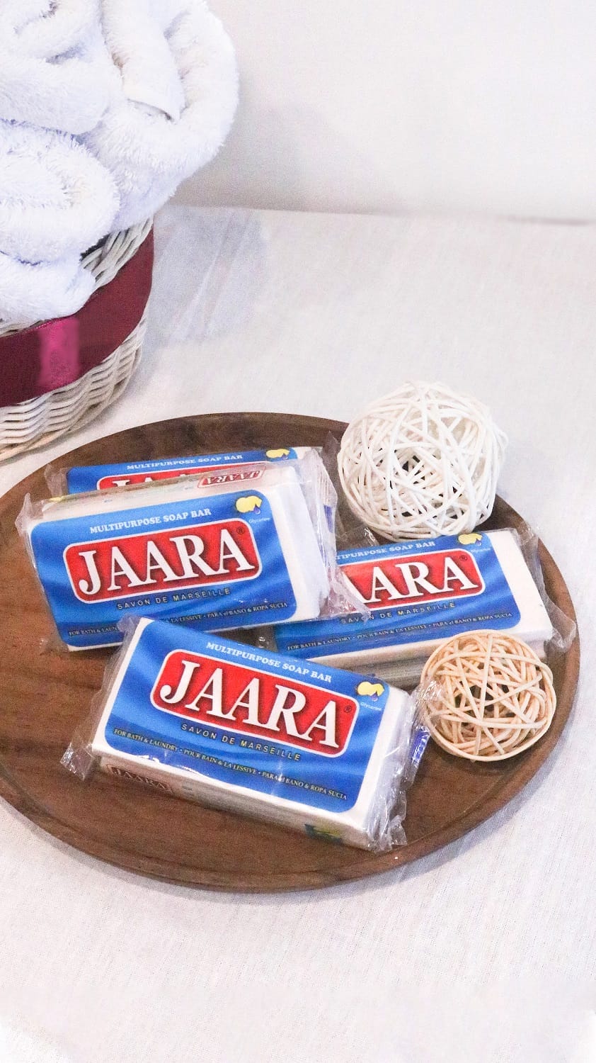 JAARA Multipurpose soap bar is in 150gr. Color can be White or other colors as request.  Fragrances are strong and soaps are HARD.  Loadibility  is 1,620 cartons / 20 FCL. The soap is used for bathing and washing clothes.  1 carton : 96 pcs  . Each soap is packed in transparent color packaging.