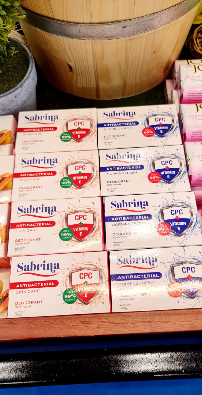 SABRINA Antibacterial Soaps is a 90gr soaps with 2 varients : Skin Care  and Morning Fresh. Each soap contain CPC and Vitamin E. It is a deodorant soap bar . For personal Hygiene, each soap bar is wrapped individually with transparent plastic and packed into innerbox.  Loadibility 1930 cartons and 1 carton : 72 pieces.