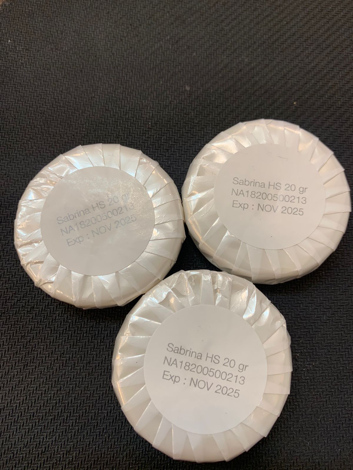 SABRINA Hotel Soap is a round soap with 20 gram. It is a paper pleated wrapping.  The soap color is white and a fragrance soap.  1 carton is 288 pieces.  Loadibility 3,300 cartons.  It is made from Palm Oil and Coconut oil. Suitable for Hotels use.