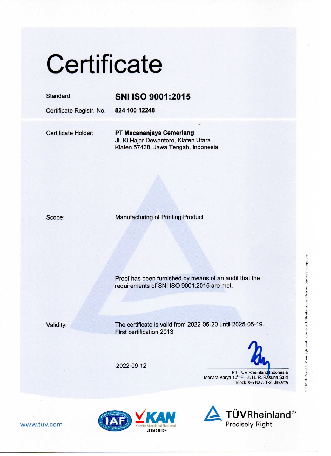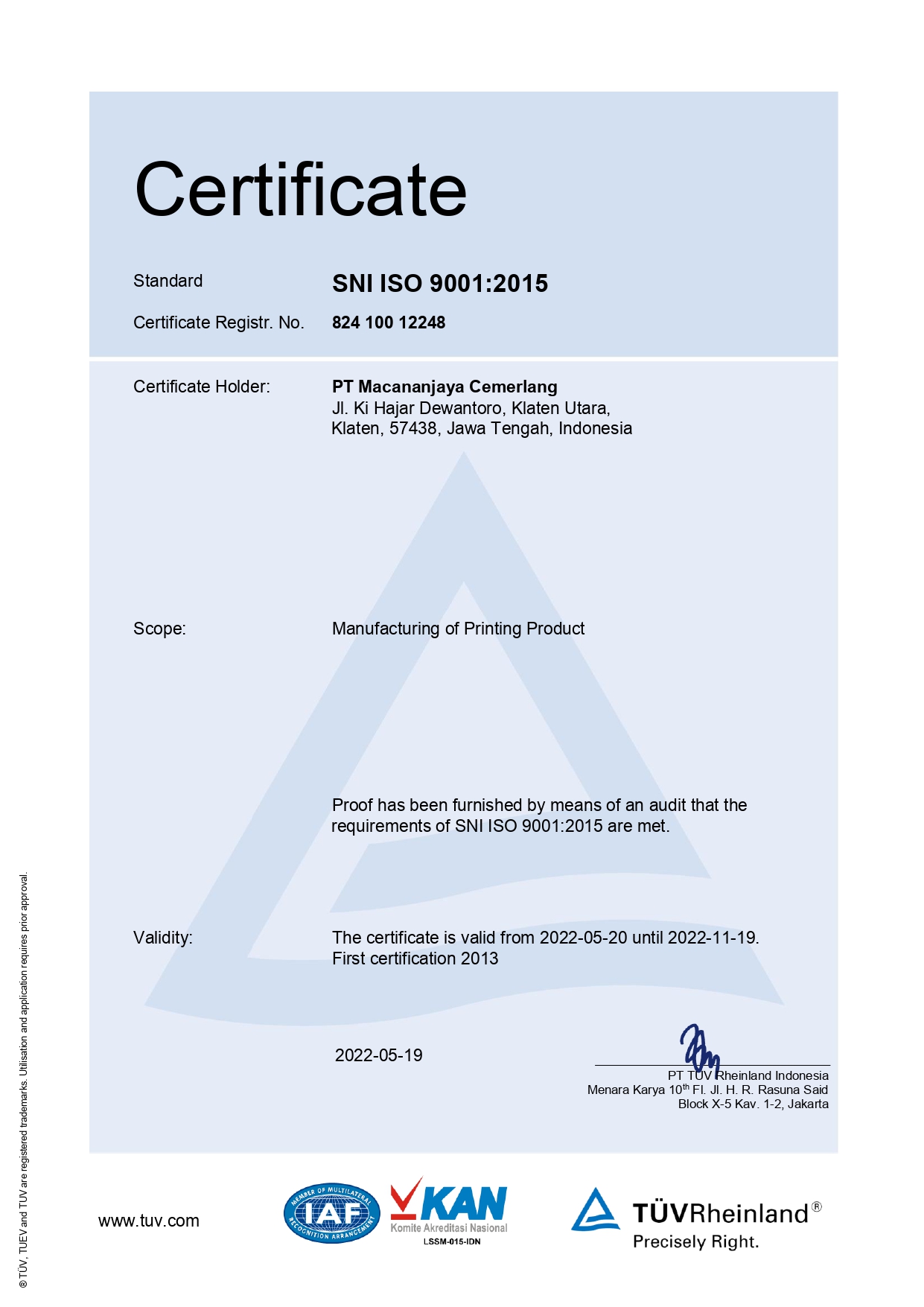 This Certificate Valid From 20 May 2022 Until 19 May 2025