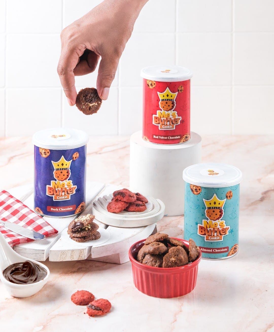 Our cookies are made from 100% processed butter with other additional ingredients such as flour, palm sugar butter, eggs, and Belgian dark chocolate filling sprinkled with chocolate chips and almond slices. And these cookies can be enjoyed as a delicious and fun snack to enjoy alone or enjoyed with additional foods such as ice cream,