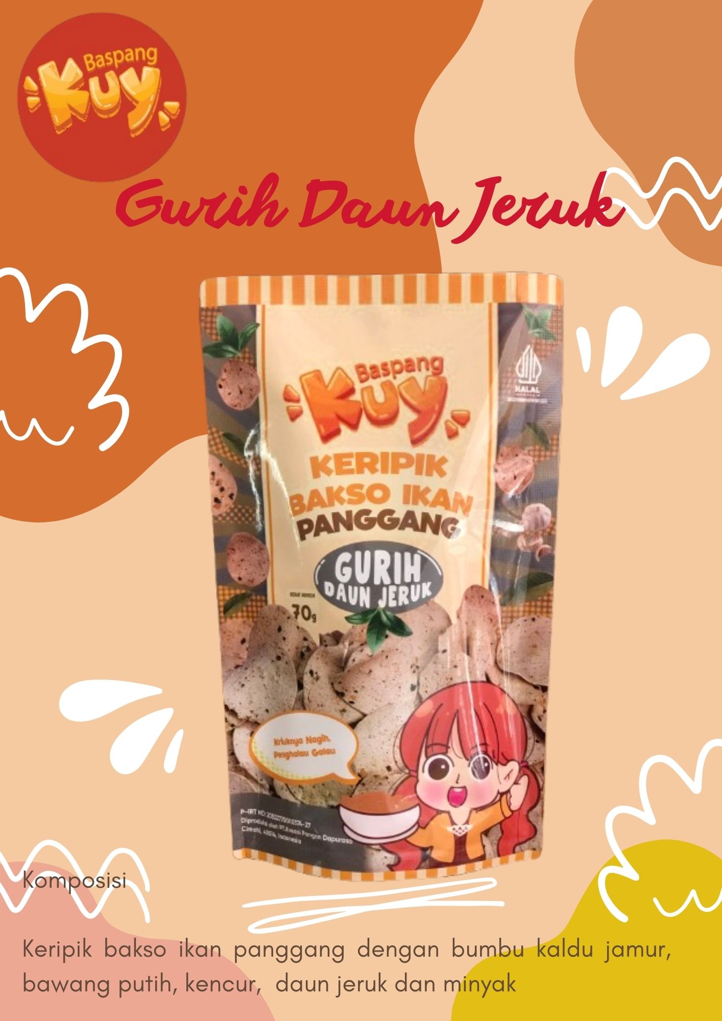 Grilled fish meatball chips (baspang), a savory variant of lime leaves, is a snack (snack) made from thinly sliced ​​ fish meatballs seasoned with mushroom broth, galangal, salt and lime leaves