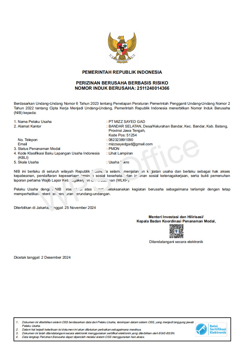 PEMERINTAH REPUBLIK INDONESIA PERIZINAN BERUSAHA BERBASIS RISIKO NOMOR INDUK BERUSAHA: 2511240014366