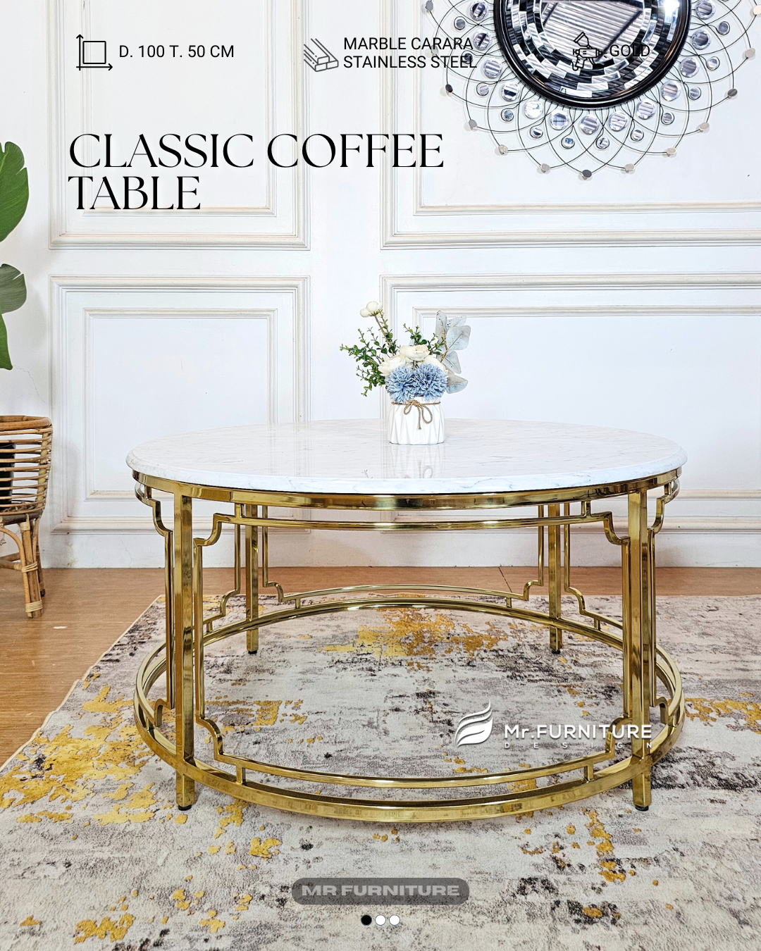 The combination of white Carrara marble with stainless gold legs makes this table not just a piece of furniture, but also a decorative element that enhances the beauty of the entire room. The clean white tones blend with the golden shine to create an elegant, warm, and luxurious impression,...