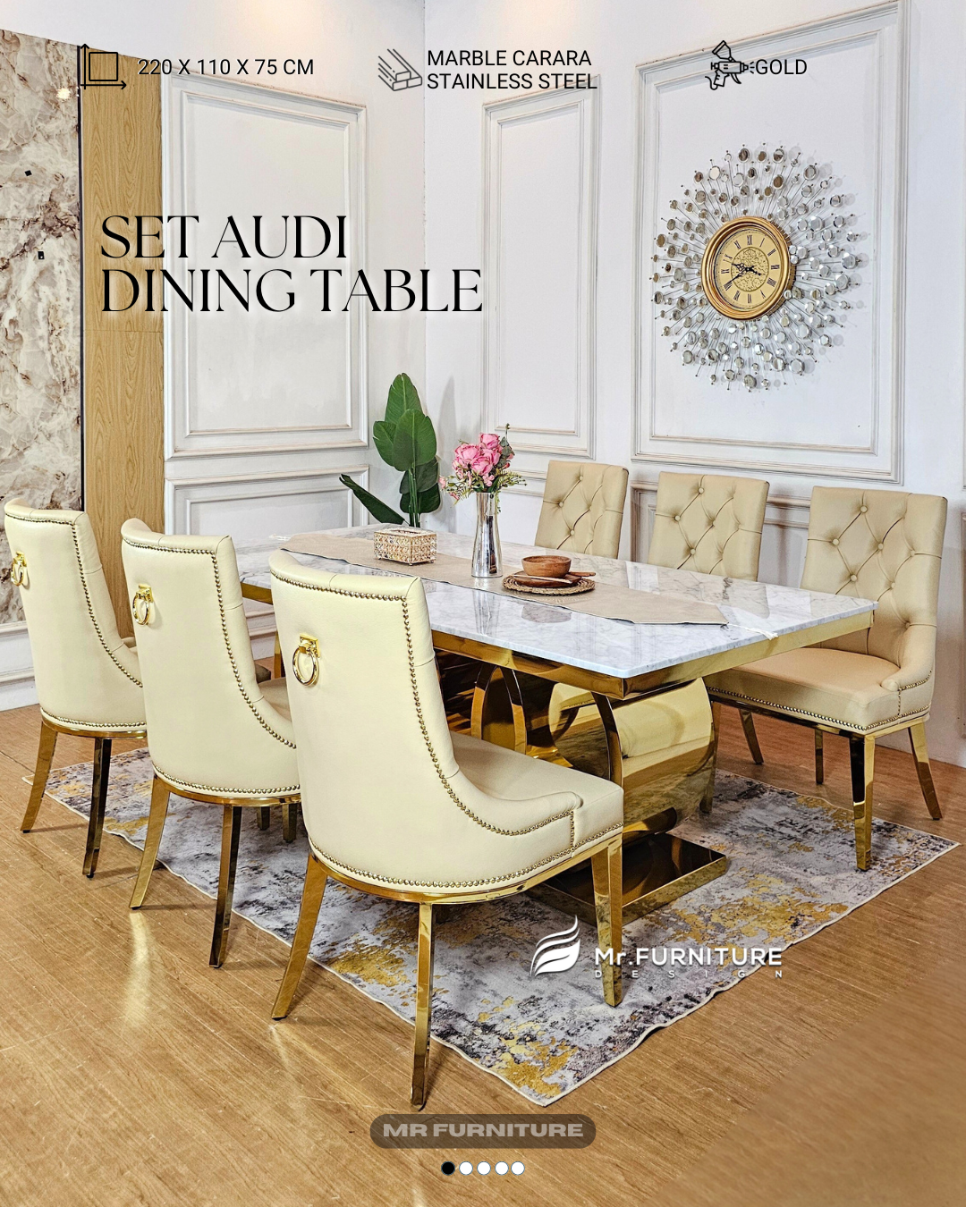 With dimensions of 220 x 110 x 75 cm, this marble dining table provides a spacious and comfortable area for enjoying meals with family or entertaining guests. Accompanied by six gold stainless steel dining chairs with plush seating, this marble dining set not only offers a luxurious appearance...