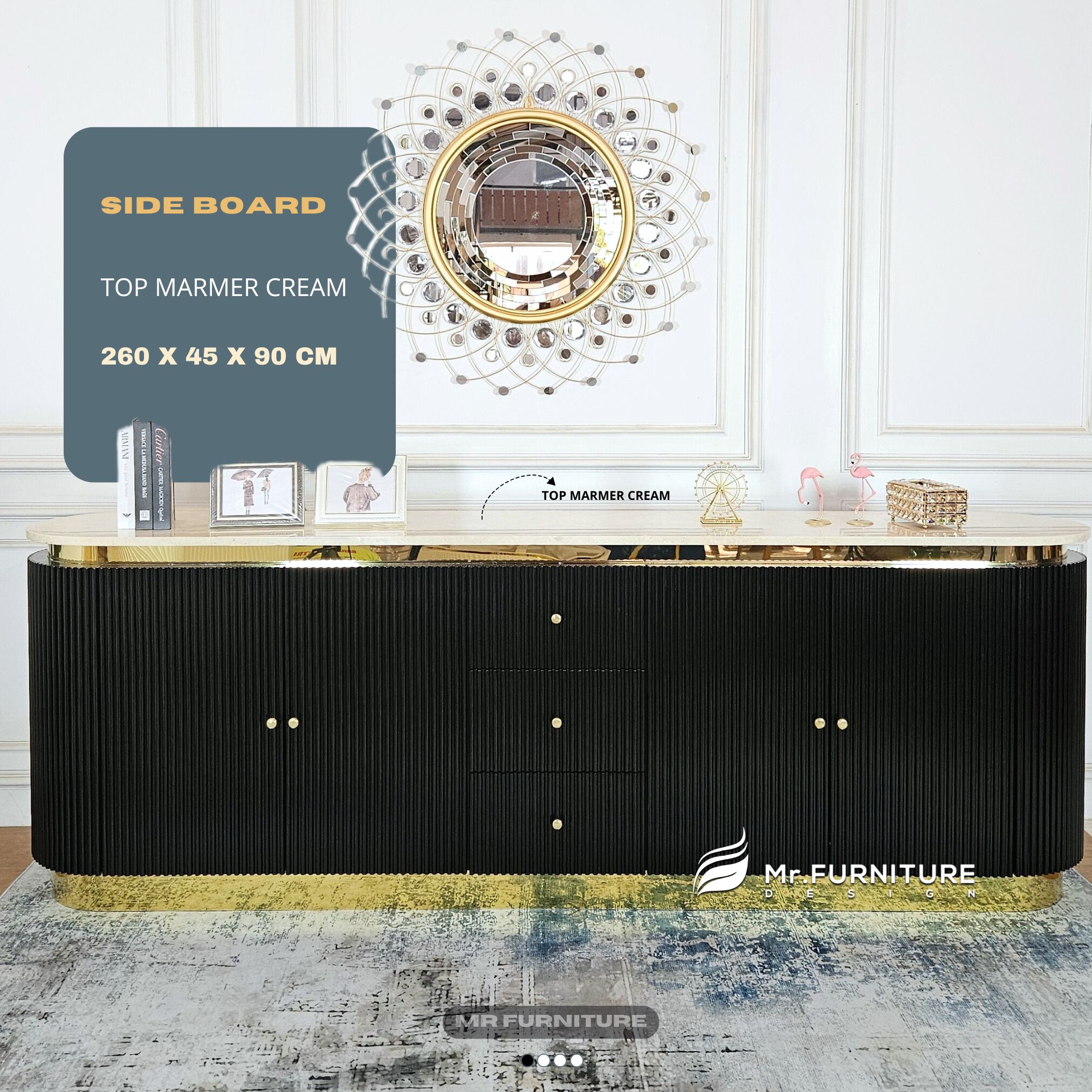 LINES SIDEBOARD BLACK INDUSTRIALIST LISS GOLD OVAL TOP CREAM MARBLE